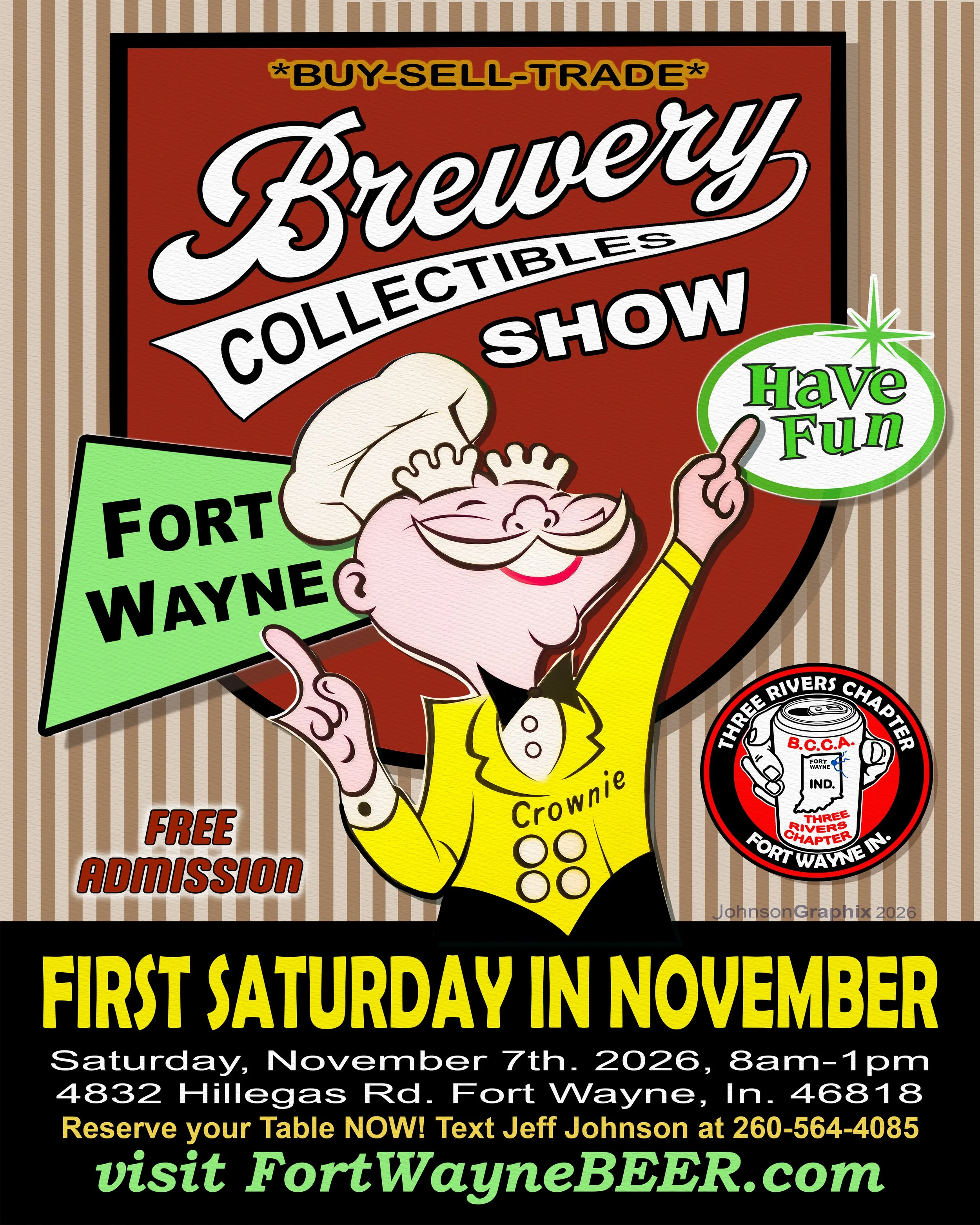 Our club was originally formed in 1974, by a group of local area beer can collectors, as a non for profit chapter of the Brewery Collectibles Club of America. Membership now primarily consists of craft beer enthusiasts that collect anything and everything beer related, with a few history nerds, and home brewers mixed in. We conduct a social gathering on the third Thursday of each month, at various locations, in and around Fort Wayne. Our meetings are very casual, and open to everyone. If you are interested in collecting, brewery history, or local craft beer, please fill free to contact us.